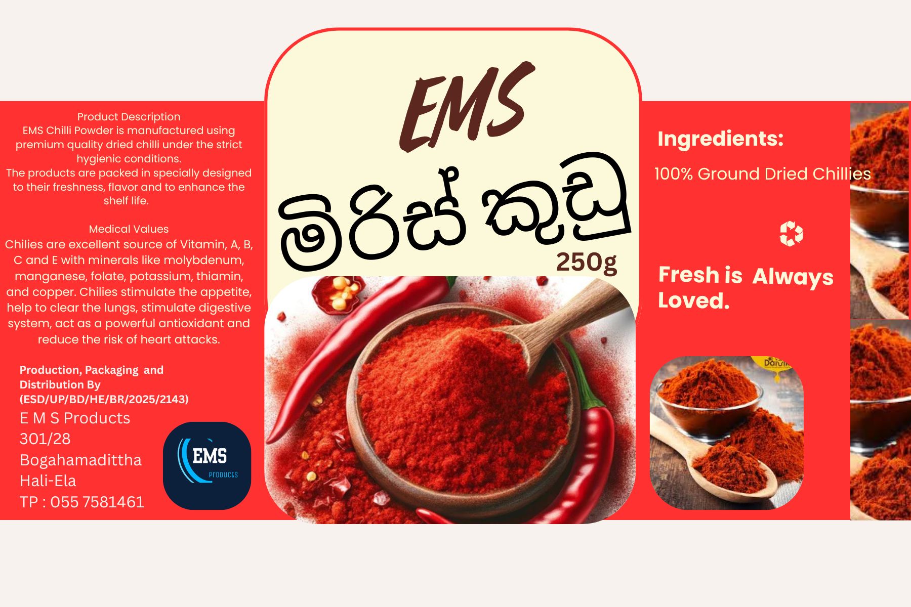EMS Chilli Powder is manufactured using premium quality dried chilli under the strict hygienic conditions.